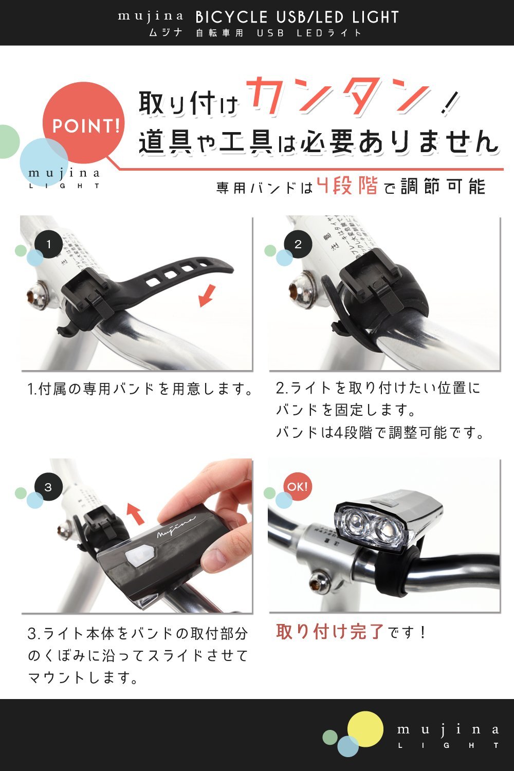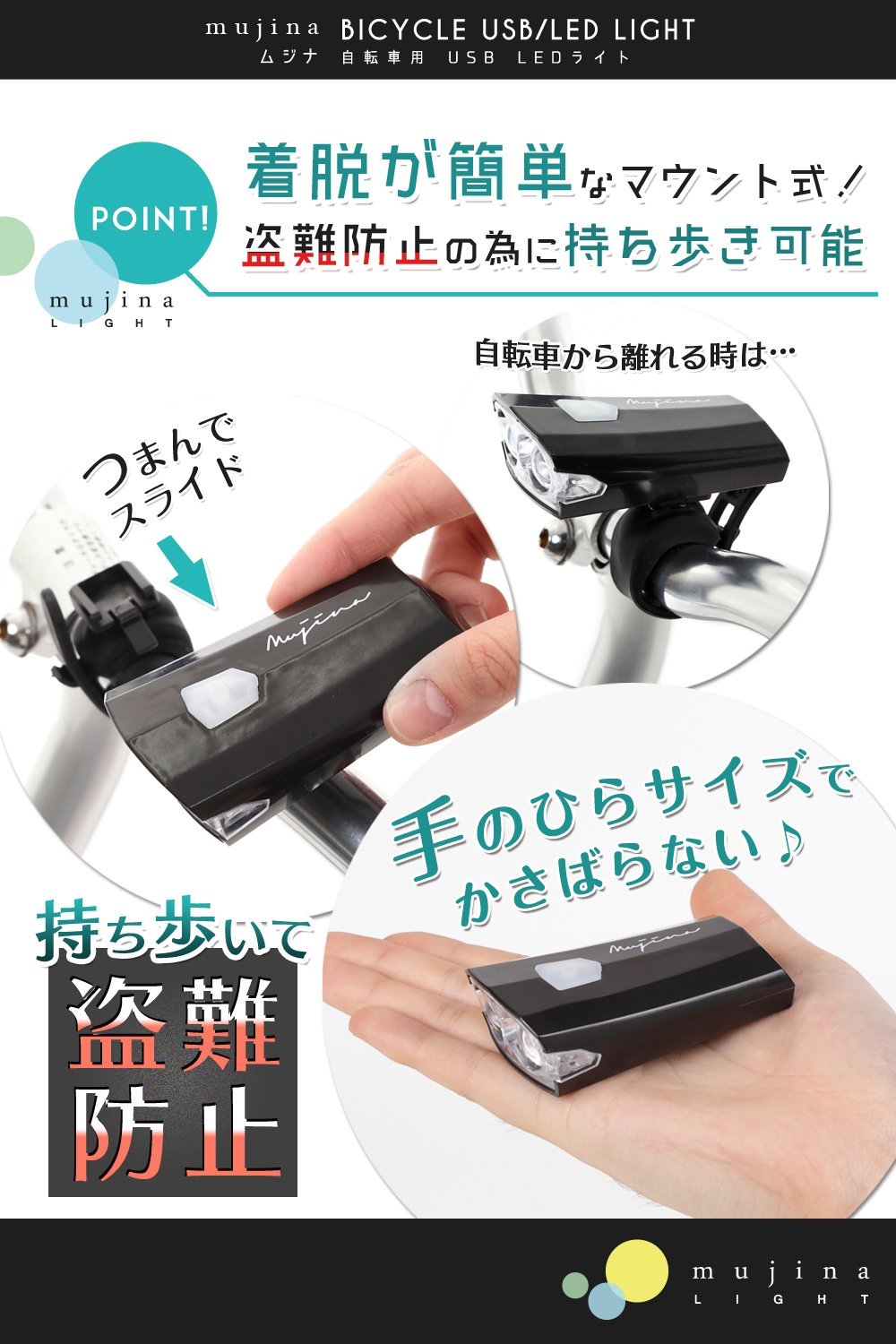 It is a mount type bicycle light that can be easily attached and detached.