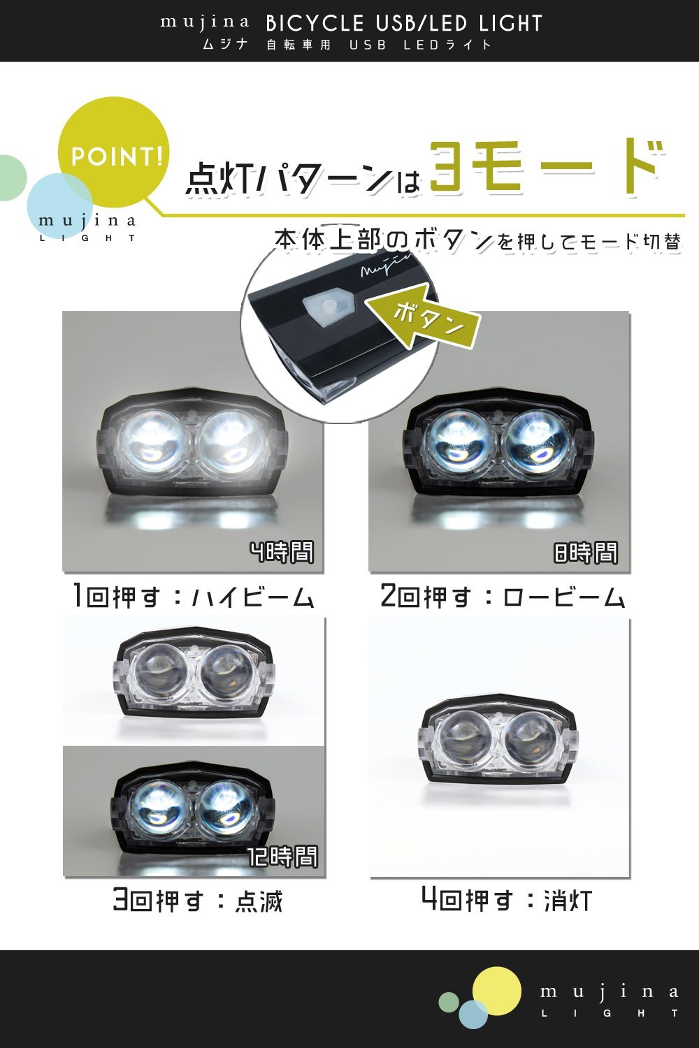 3 Lighting mode: steady (4 hours), low beam (8 hours), flashing (12 hours)