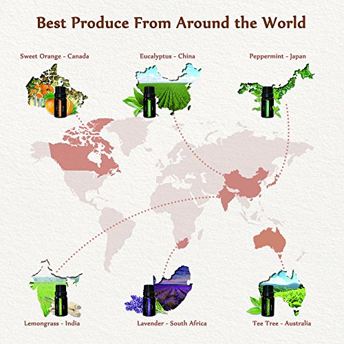 -. Feature : Aromatherapy oils top 6 gift set: Contains the following therapeutic essential oils: Lavender, Lemongrass, Peppermint, Eucalyptus, Tea Tree, and Sweet Orange. / 100% pure and natural: No fillers, synthetics, additives, bases, or carriers added.100% certified Pure Therapeutic Grade Essential Oil. Sested use with carrier oil such as: jojoba oil, argan oil, coconut oil, sweet almond oil, avacado oil etc. For external use only. / Therapeutic grade: Great for aromatherapy and relaxation, usable in fragrance diffusers, oil burners, massage oil, shower gel, shampoo, bath water, etc. / The perfect quality gift set: Christmas, Birthdays, Anniversaries, Holidays, Teachers Day, Father's Day, Mother's Day - every occasion is the perfect one for this gift set. Also, keep a few boxes stocked for daily treats of refreshment! / Taste the world: Experience six authentic essential oil flavors cultivated and produced from around the world, then delivered right to your doorstep.