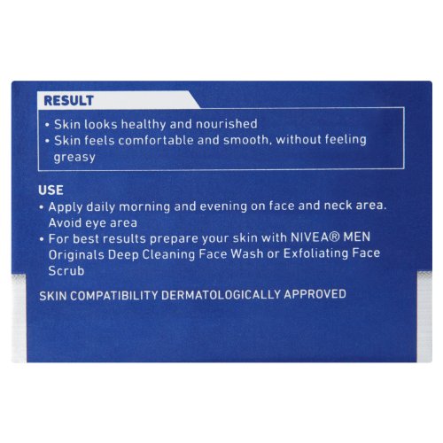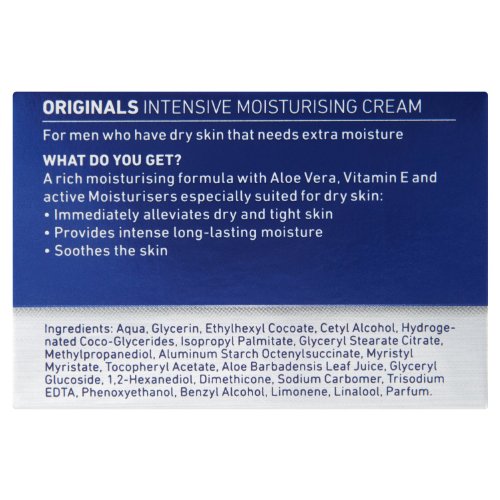 -. Binding : Health and Beauty -. Brand : Nivea -. EAN : 0721865033018 -. Feature : Please be aware that unless expressly indicated otherwise, Cooking Marvellous are not the the manufacturer of this product. Product packaging may vary from what is shown on this listing. We recommend that you do not rely solely on the information presented on our listing. Please always read the labels, warning and directions provided before using or consuming the product. -. IsAdultProduct : 0 -. Label : Grocery -. Manufacturer : Grocery -. Model : 88812 -. MPN : 88812 -. PackageQuantity : 1 -. PartNumber : 88812 -. ProductGroup : Beauty -. ProductTypeName : BEAUTY -. Publisher : Grocery -. Studio : Grocery -. Title : Nivea Men Originals Intensive Moisturising Face Cream (50ml) -. UPC : 721865033018