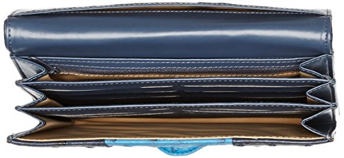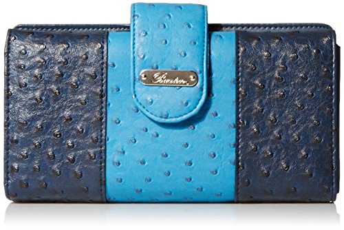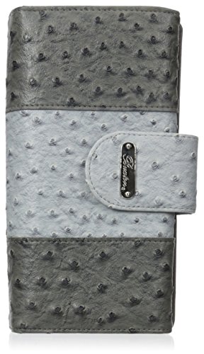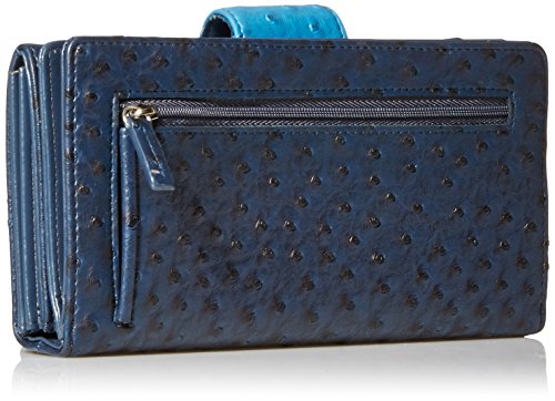 Ostrich Embossed Man-Made Material in Coordinating Colors Shiny Nickel Logo Hardware Snap Buckle Tab Closure with Outside Gusseted Zipper Coin Purse Multiple Credit Card Slots, I.D. Window and Gusseted 3 Pocket Large Interior Additional Credit Card Slots, Interior Zipper and 2 Slip Pockets
