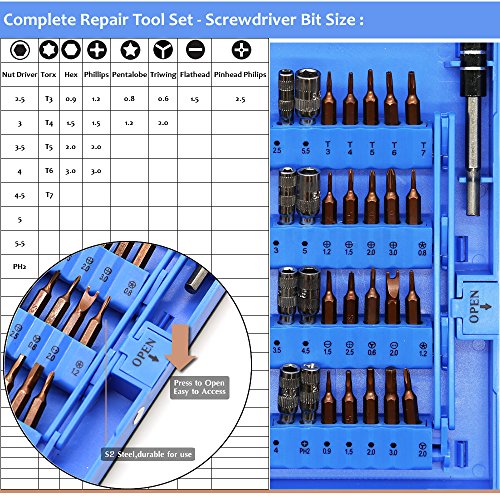 - The professional screwdriver bit set include Phillips screwdriver bit(1.2 1.5 2.0 3.0),Triwing screwdriver bit(0.6, 2.0), Torx screwdriver bit(T3 T4 T5 T6 T7),hex bits(0.9 1.5 2.0 3.0), Flathead bits 1.5 and P2 P5 pentalobe screwdriver bits etc.