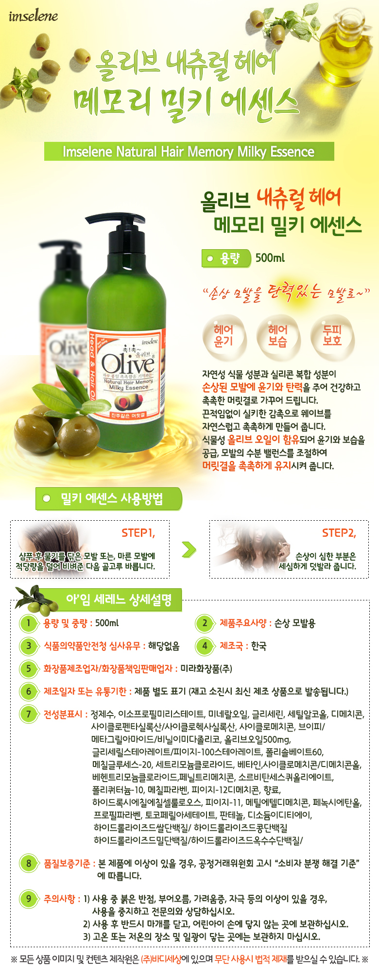 ヘアーのツヤ・ヘアー保湿・頭皮保護のオリーブナチュラルヘアメモリミルキーエッセンス! オリーブオイルの抽出物成分がツヤと保湿を補給し、毛髪の油分・水分バランスを合わせ、 さらさら健康ヘアーに仕上げます。 【使用方法】 1. シャンプーの後に水気を取った後や、乾いた毛髪に適当量を取ります。 2. ダメージがひどい部分は重ね塗ってください。 【商品構成】 オリーブナチュラルヘアメモリミルキーエッセンス500ml