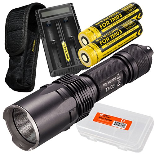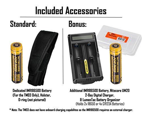 - CHARGER BUNDLE: Contents include Nitecore TM03 Flashlight, Premium Holster, spare o-ring, PLUS 2x dedicated IMR18650D batteries, Nitecore UM20 Dual-bay digital charger, & LumenTac battery organizer capable of holding 2x 18650 or 4x CR123A Batteries