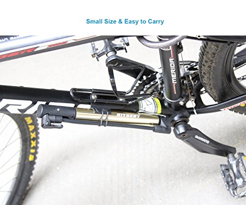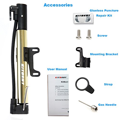 -. Feature : Mini Aluminum Alloy Bicycle pump barrel, ULTRA DURABLE design and EASY TO CARRY. The bike pump is small enough to easily fit in your bike bag too. You will be able to deal with a flat tire outside anywhere and anytime. Kitbest Mini bike floor pump is one of the most powerful lightweight bicycle Floor pumps available. / ULTRA LIGHTWEIGHT & A FULL RANGE OF ACCESSORIES: It is almost weightless (only 200g) and extremely compact that can be attached to the bike frame under the water bottle cage with the mounting bracket. ACCESSORIES include Gas needle to inflate the sports balls, Mounting bracelet to attach the pump on the bike, Rubber Binding Strap to fix the tube, Glueless puncture repair kit to be prepared for a flat tire anywhere and User manual / EASY TO USE Dual action pumping and thumb lock, up to 130 psi capacity that allows you to use this floor pump to inflate the bike tire from flat during emergencies repair or keep the tire pressure up during the long rides. In addition. You are also able to inflate the sports balls with the gas needle. DON'T RIDE WITHOUT IT, it is your best partner of bike / BONUS: KitBest bike tire pump also comes with glueless emergency puncture kit so you'll never have to worry about being left stranded with a flat tire. / We are committed to provide excellent customer service with our UNCONDITIONAL Free Replacement or Money back guarantee for a period of 5 years