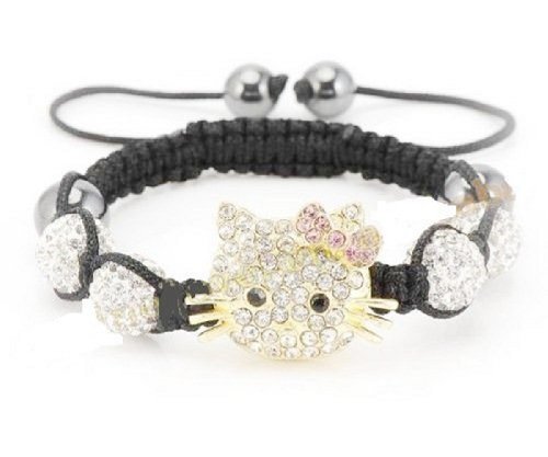 This Shamballa bracelet showcases 4 white pave crystal balls and 4 Magnetite Beads. The central Hello Kitty inspired piece is decorated with crystals. Closure: Adjustable strand. The balls measure 10 mm each. The bracelet measures about 7 inches. Impressive and fun gift idea.Feature