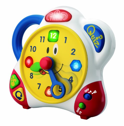 Fewer kids are learning analog time, and educators say they're missing out! Reading an analog clock expose kids to math concepts that digital clocks don't, like fractions, 'clockwise,' and counting-by-fives. Besides, this talking, teaching clock is fun! Move the clock hands, and hear the time. Then play the quiz game and test your time-telling skills. With bilingual English/Spanish modes, two songs, and a fun, light-up clock face. Batteries included. For ages 2 and up. Along with analog time-telling skills, this learning clock teaches kids to identify shapes and numbers in both English and Spanish The finger hole in the minute hand makes it easy to change the time Includes carry handle for take-along play Two-level volume control Requires 3 "AA" batteries (included) 2 1/4"L x 9 1/2"W x 8 1/2"HFeature