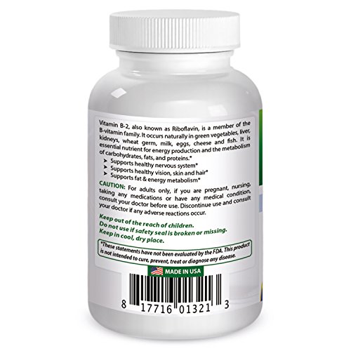 -. Feature : Supports Fat & Energy Metabolism -- Coenzyme Precursor / Riboflavin aids in the metabolism of carbohydrates, proteins, and fats to produce vital energy for the body. Riboflavin also helps support healthy vision and skin. / Supports the body during the stress of daily living / Vitamin B2 is necessary for normal cell function, and helps to maintain a healthy nervous system, vision, skin and hair. / All Best Naturals products are manufactured in accordance with Good Manufacturing Practices (GMP), among the highest standards in the world -- Proudly Made in USA -- Purity & Potency Guaranteed