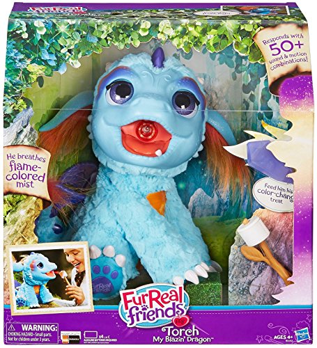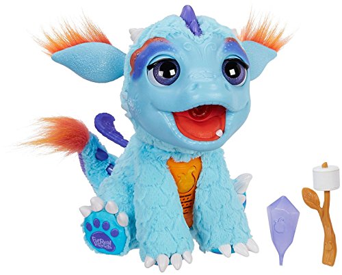 You're not dreaming. It's FurReal! This playful little guy is just learning the tricks of the dragon trade, so he doesn't really breathe flame, but he does breathe flame-colored mist. Really! Hold the color-change treat to his mouth and watch how it changes when FurReal Friends Torch, My Blazin' Dragon breathes mist onto it! When does he breathe such colorful mist? Whenever someone touches his charm, pets his nose, or... sometimes whenever he feels like it! There's never a dull moment with this adorable baby dragon! Includes pet, color-change treat, water vial, 2 extra filters, and instructions. Requires 4 C batteries (Not included). Ages 4 and up.Feature