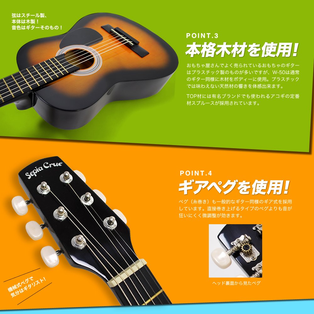 Many toy guitars sold at toy shops are made of plastic, but the W - 50 uses wood for the body like a normal guitar.