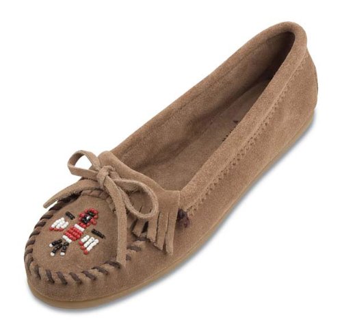 Our Minnetonka Women's Moccasins feature Native American beaded Thunderbird design with a graduated fringe kiltie and tie. Attractive and comfortable, these moccasins are sure to become your favorite Imported. As an authorized retailer of Minnetonka Moccasin products, we cannot accept orders from outside the United States for Minnetonka products. We are very sorry for any inconvenience this may cause you.Feature