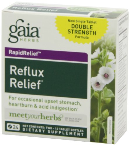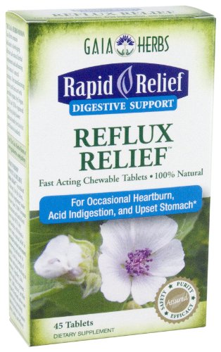 Studio : Gaia Herbs Publisher : Gaia Herbs Binding : Health and Beauty Product Description Reflux Relief combines botanicals with mineral nutrients to provide relief for occasional heartburn and acid indigestion while promoting healthy stomach function. Natural source of Sodium Bicarbonate and Calcium Carbonate work as neutralizers to maintain stomach acid balance. Organic extracts of soothing plants such as Aloe, Marshmallow, Barley, Licorice, and Chamomile promote healthy gastric function. Conditions that come rapidly can go rapidly, when you give your body the right support. Gaia Herbs' RapidRelief products deliver results fast so you can get back to health and well being. 0