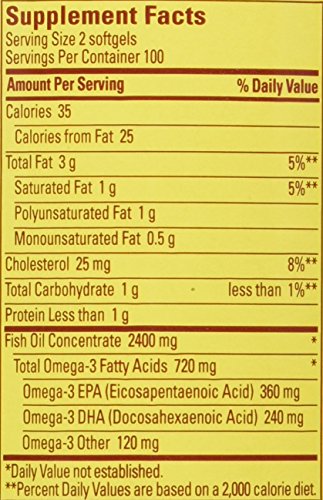 Fish Oil helps protect the heart by keeping cell membranes (walls) flexible and healthy. Trust your heart health with Nature Made Fish Oil 1200 mg. Every 2 softgels deliver 720 mg of Omega-3s. The Omega-3s in Fish Oil help protect the heart by keeping cell membranes (walls) flexible and healthy. •Supportive but not conclusive research shows that consumption of EPA and DHA Omega-3 fatty acids may reduce the risk of coronary heart disease. (See nutrition information for total fat, saturated fat, and cholesterol content.) •EPA and DHA are the two key Omega-3s for heart health •Every 2 softgels deliver 720 mg of Omega-3s, including 600 mg of EPA & DHA (360 mg EPA/240 mg DHA); more than the 500 mg of EPA and DHA recommended by some experts for heart health. Nature Made Fish Oil 1200 mg is guaranteed to meet our high quality standards - it is made from carefully selected ingredients under strict manufacturing processes. •Nature Made is the #1 Pharmacist Recommended Brand* •United States Pharmacopoeia (USP) Verified •Purified to remove mercury •Nature Made Fish Oil supply only comes from deep ocean waters, not farm raised fish •No Artificial Colors or Flavors •No Preservatives •No Yeast, Starch or Gluten *Based on US News & World Report - Pharmacy Times Survey, Nature Made is the #1 Pharmacist Recommended Brand in Eight Segments - Letter Vitamins, Omega-3/Fish Oil, Coenzyme Q10, Flax Seed Oil, Herbal supplements, Cholesterol Management-Natural, Garlic and Diabetic Multivitamins OTHER INGREDIENTS: Gelatin, Glycerin, Water, Tocopherol. Contains: Fish (Anchovy, Sardine, Mackerel) and Soy.Feature