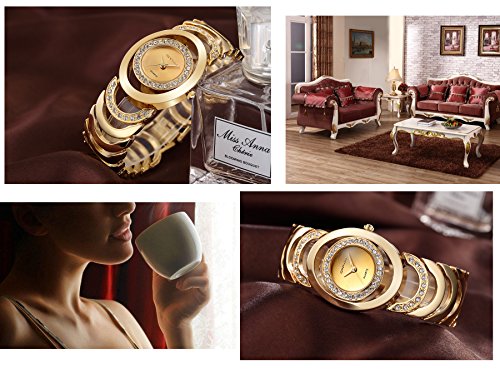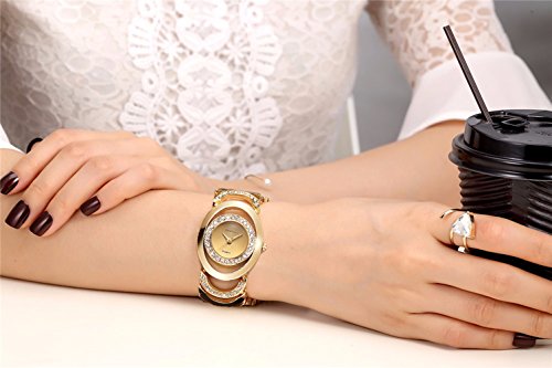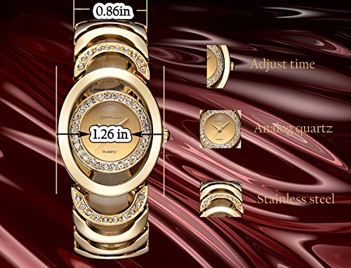 The contemporary gold oval-round wrist watch design is to meet the trending of classic featuring diamonds Stainless steel tone bracelet.