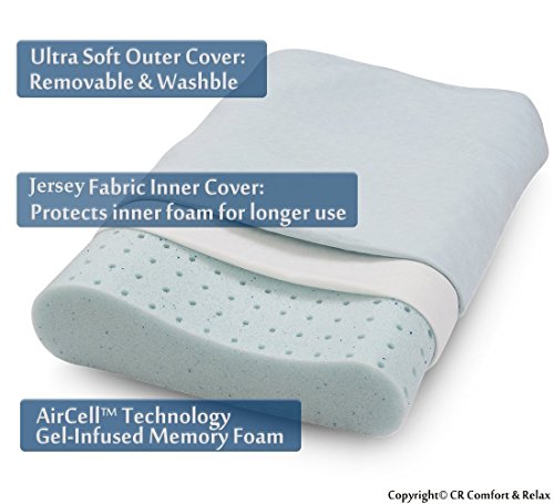 Cr Sleep Unique AirCell Technology Gel-infused Memory Foam Pillow Don¡?t let neck pain prevent you from having a sleepless night. Neck pain may cause a lot of discomfort while you are awake, but it should not keep you up all night. Just choose the Cr Contour Textured Gel-infused Memory Foam pillow, which will help ease your neck pain. The Cr Contour Texture gel-infused memory foam pillow will relieve neck pain by enabling the muscles around it to fully relax. It does the same to the shoulders and back. It also promotes proper spinal alignment thanks to its ergonomic shape. This lets the user retain the shape for continued rest and support throughout the night. The Cr Contour Texture gel-infused memory foam pillow does not retain heat. This pillow has a unique, Textured cover in addition to Aircell technology that improves airflow, help disperse body heat and ensures a cooler sleep at night. The Cr Contour Texture gel-infused memory foam pillow that is an excellent choice for side sleepers due to its contour shape. There are two lofts for choice to sleep on, low loft and high loft, you can sleep on your side. And it gives the needed support for your neck while you sleep on your side. Care Instructions The foam we use is CertiPUR-US certified for safety and performance, which means it does not contain any toxic ingredients like formaldehyde, methane chloride, or PBDE and provides a protective barrier against allergens such as mold, dust mites, and other bacteria. In case you experience an odor which is a ""Fresh Foam"" odor, it is not harmful. The odor should dissipate several days later after the pillow is unpacked and aired out. Store in a Cool and Dry Area Direct away from Sunlight. The Inner Core is Spot Clean Only with Damp Cloth. ATTENTION: DO NOT PUT FOAM IN WASHER! 0 |