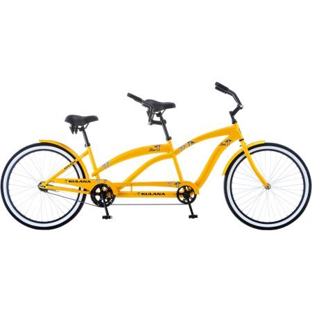 Studio : Pacific Cycle Publisher : Pacific Cycle Binding : Misc. Product Description The Kulana Lua Tandem Bike 26 is here to take the fun factor of tandem biking to a new level. Two extra large and comfortable cruiser saddles are mounted on a stylish yellow HI-Ten cruiser frame, with easy reach handlebars and fun beach graphics. The frame, graphics and the whitewall tyres together present a colorful look to the tandem bicycle. Be assured of years of exercise and fun while touring around on bike paths, light trails, or when cruising along a quiet beachside lane. The super-relaxed riding position and padded seats are tailor-made and lets you enjoy the scenery while having fun with your family. The integrated rear coast brakes showcase powerful braking irrespective of the weather conditions. Half wrap front and rear fenders are employed in the Hi-Ten steel bike to add further convenience in diverse weather conditions. Great news! If you select Site to Store delivery, you can call your local store as complimentary assembly may be offered at that location. Kulana Lua 26-Inch Tandem Bike: Hi-Ten steel Kulana tandem frame with oversized fork Extra-large cruiser spring saddles for comfort Easy-reach cruiser handlebars and cruiser rise stems for upright, relaxed riding positions Rear coaster brake eliminates cables keeping the bike neat and sleek Half wrap front and rear fenders for convenient riding in any weather 0