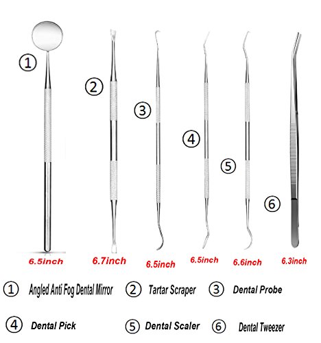 Package including: 1.1 * Angled Anti Fog Dental Mirror 2.1 * Tartar Scraper 3.1 * Dental Probe 4.1 * Dental Scaler 5.1 * Dental Tweezer 6.1 * Dental Pick 7.1 * User Manual