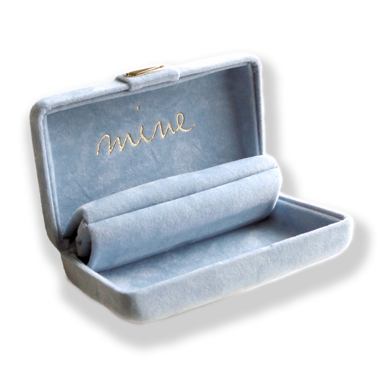素材 ワイン・ブラック・サクラ・ブルー・グレー:合成セーム ローズ(内装ブラウン)・アイボリー(内装ブラウン):サテン ケースサイズ:幅8.7cm×奥行5.8cm×高さ3.5cm 付属品:白化粧箱