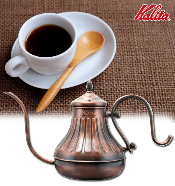 形もオシャレなドリップポットです。銅は熱伝導性がよく温まりやすいため、何度も注ぎ分けるハンドドリップコーヒーに向いています。水・お湯の触れる内側にはメッキ加工を施していますので、水質の変化はおきません。 |