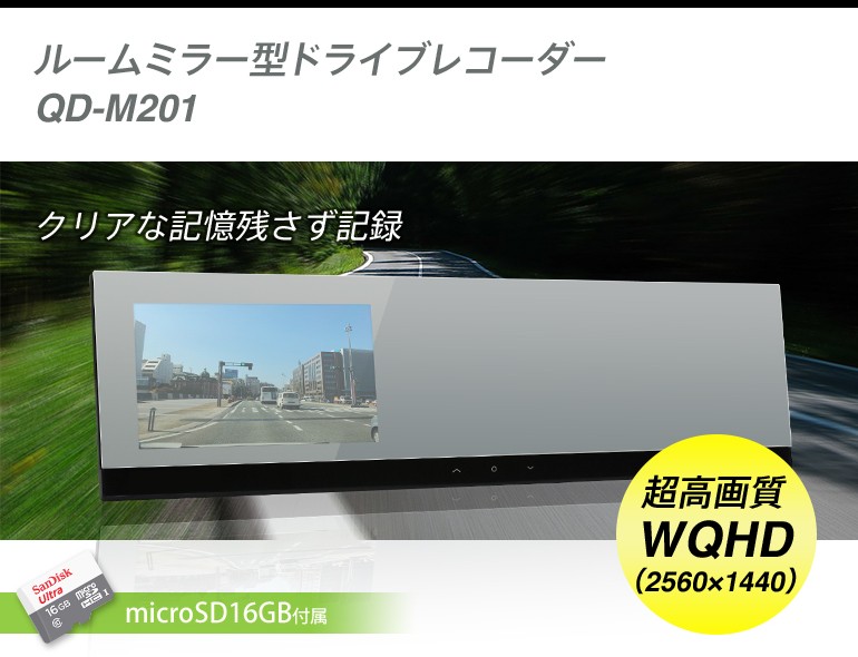 | ルームミラー型 ドライブレコーダー QD-M201 ★大人気のルームミラー型ドライブレコーダーQD-M101に新たに2Kモデルが登場! ・WQHDの超高画質録画! |