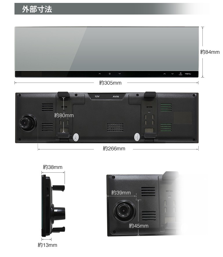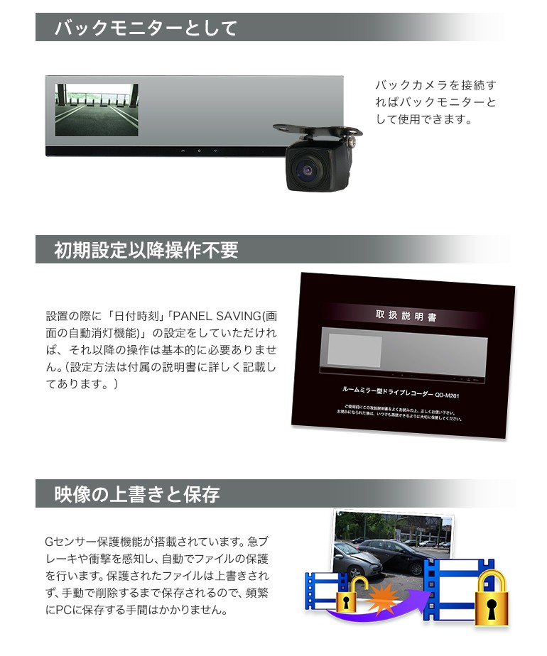 | 商品名 | ルームミラー型 ドライブレコーダー QD-M201 |