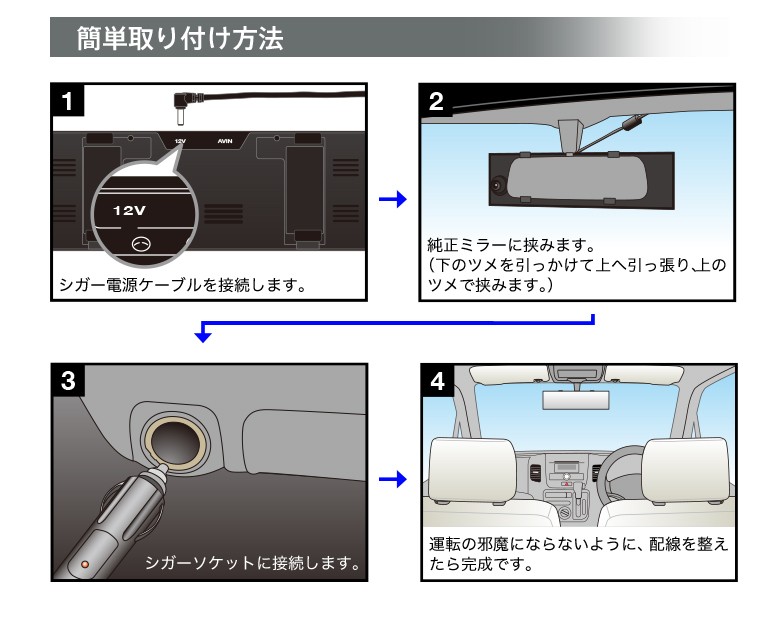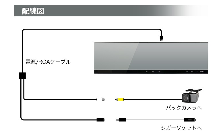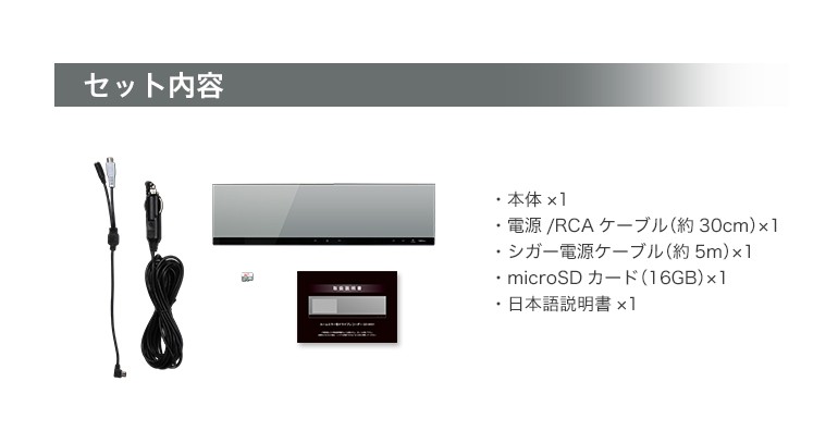 | ・本体 ・電源/RCAケーブル(約30cm)×1 ・シガー電源ケーブル(約500cm)×1 ・microSDカード 16GB×1 ・日本語説明書×1 ※本製品にはバックカメラは付属しておりません。 |