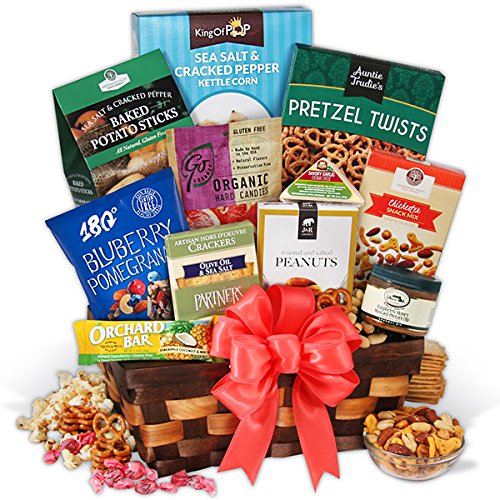 -. Feature : Keep them healthy with this generous arrangement, exclusively from GourmetGiftBaskets.com! Inside a classic woven basket, your recipient will discover an assortment of carefully selected foods that are wholesome as well as delicious. / Includes gourmet roasted peanuts, our exclusive Chichester Snack Mix, pretzel twists, deli crackers, baked potato sticks, blueberry pomegranite trail mix, our exclusive KingofPOP Sea Salt & Cracked Pepper Popcorn, raspberry honey mustard pretzel dip, savory garlic cheddar cheese, organic blood orange candies, and a pineapple, coconut, and macadamia Orchard Bar! / Keepsake basket with healthy treats is professionally shrink wrapped with a festive ribbon. / 100% Satisfaction Guarantee for you and your recipient only from seller GourmetGiftBaskets.com!