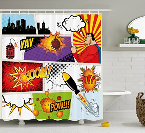 Superhero Shower Curtain by Ambesonne, Retro Comic Book Speech Bubbles Mock-Up Symbols Sound Effects Anger Brave Graphic, Fabric Bathroom Decor Set with Hooks, 70 Inches, Multicolor