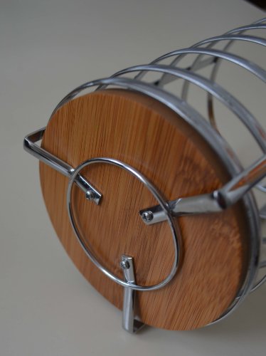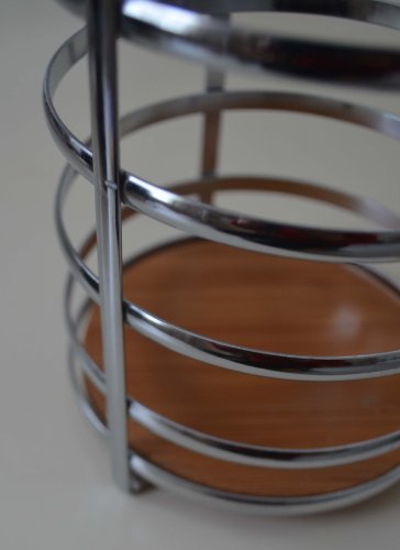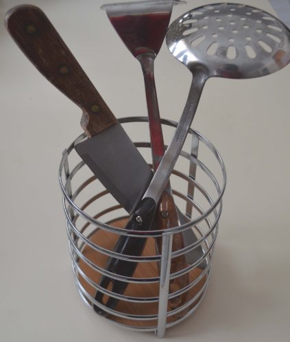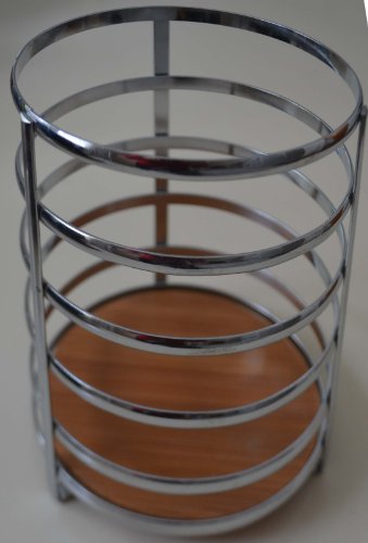 CHROME UTENSIL HOLDER CADDY W/BAMBOO BASE. 5" DIA X 7.5" H