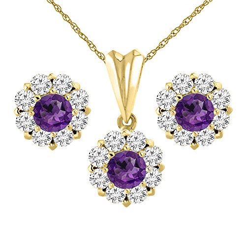 -. Title : 14K Yellow Gold Natural Amethyst Earrings and Pendant Set with Diamond Halo Round 6 mm