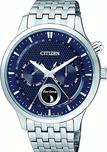 -. Feature : ◆Citizen AP1050-56L ◆ステンレスケース ◆ステンレスベルト ◆サファイヤガラス ◆サイズ直径約42mm/厚さ約10mm ◆エコドライブ(ソーラーバッテリー) ◆トリプルカレンダー(月、日付、曜日) ◆ムーンフェイズ ◆5気圧防水(50m防水) ◆保証書、説明書、専用BOX付属
