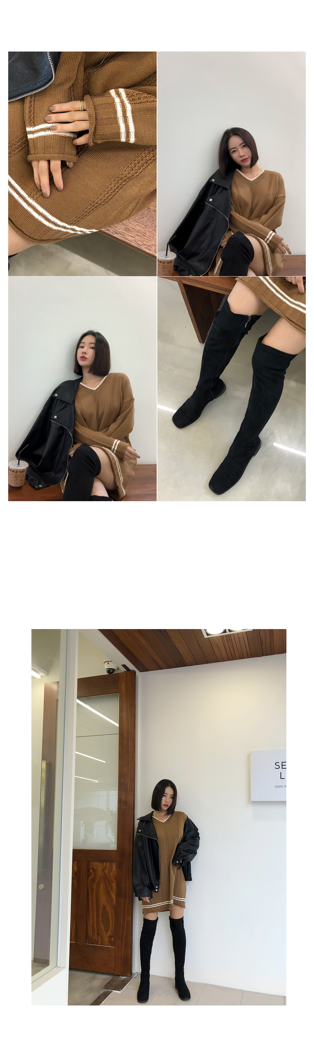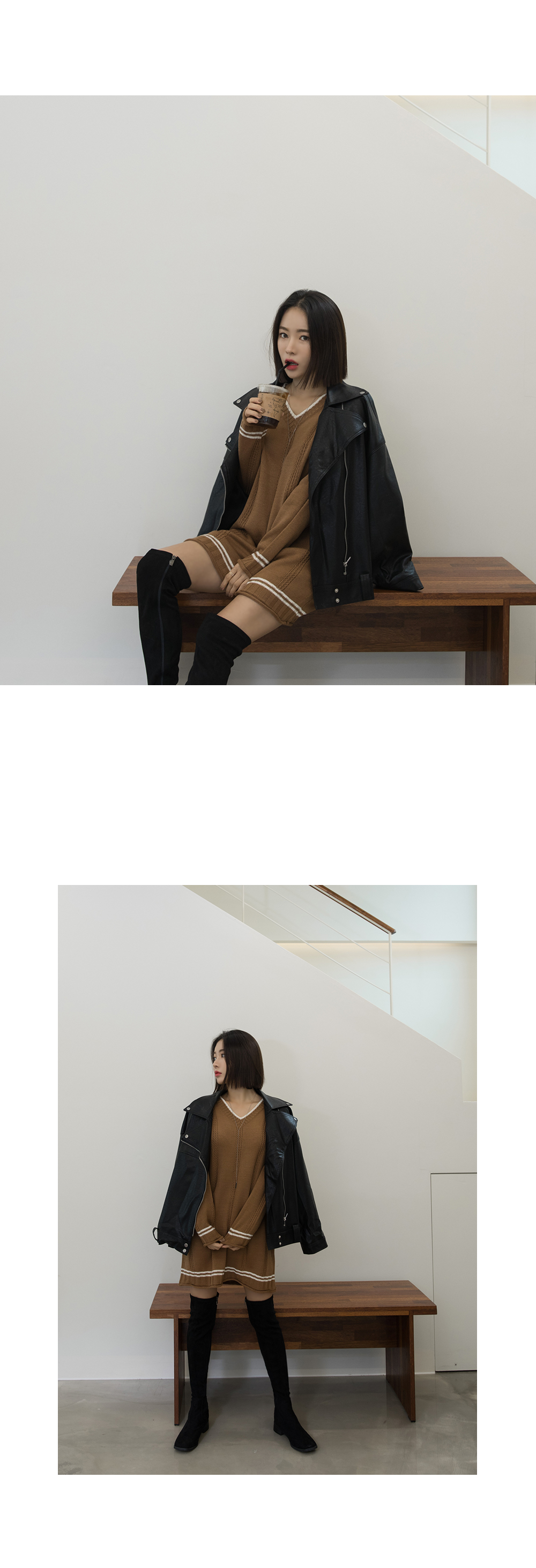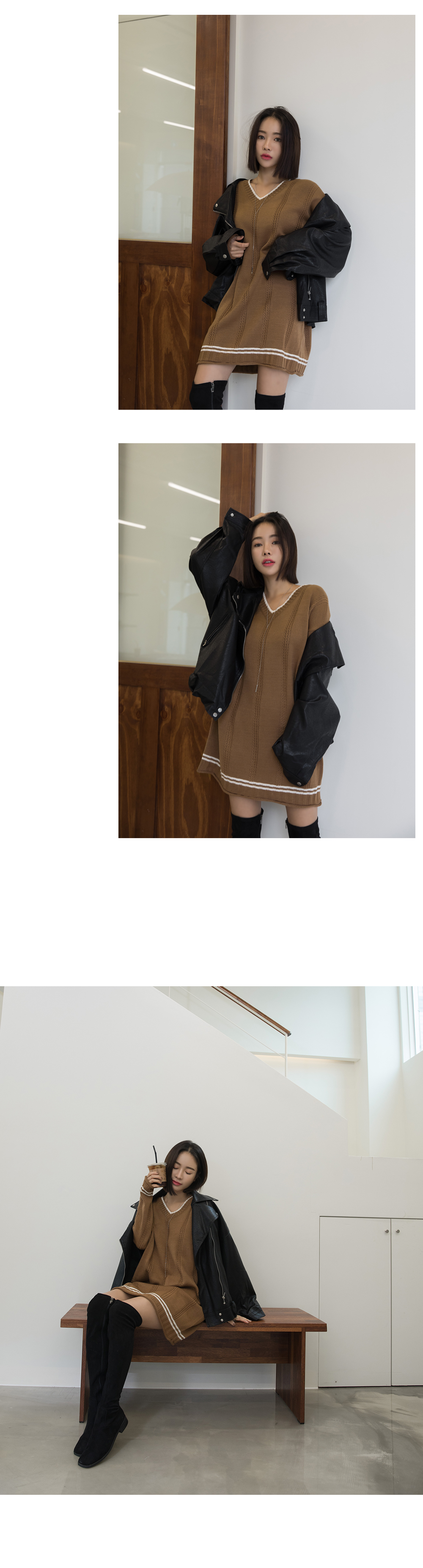 브이네크라인과 소매, 밑단 배색 포인트로 더욱 감각적이구요.