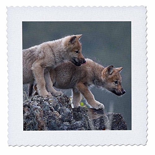 3dRose Curious Gray Wolf, Canis Lupus, Pups, Montana Quilt Square, 10 x 10"