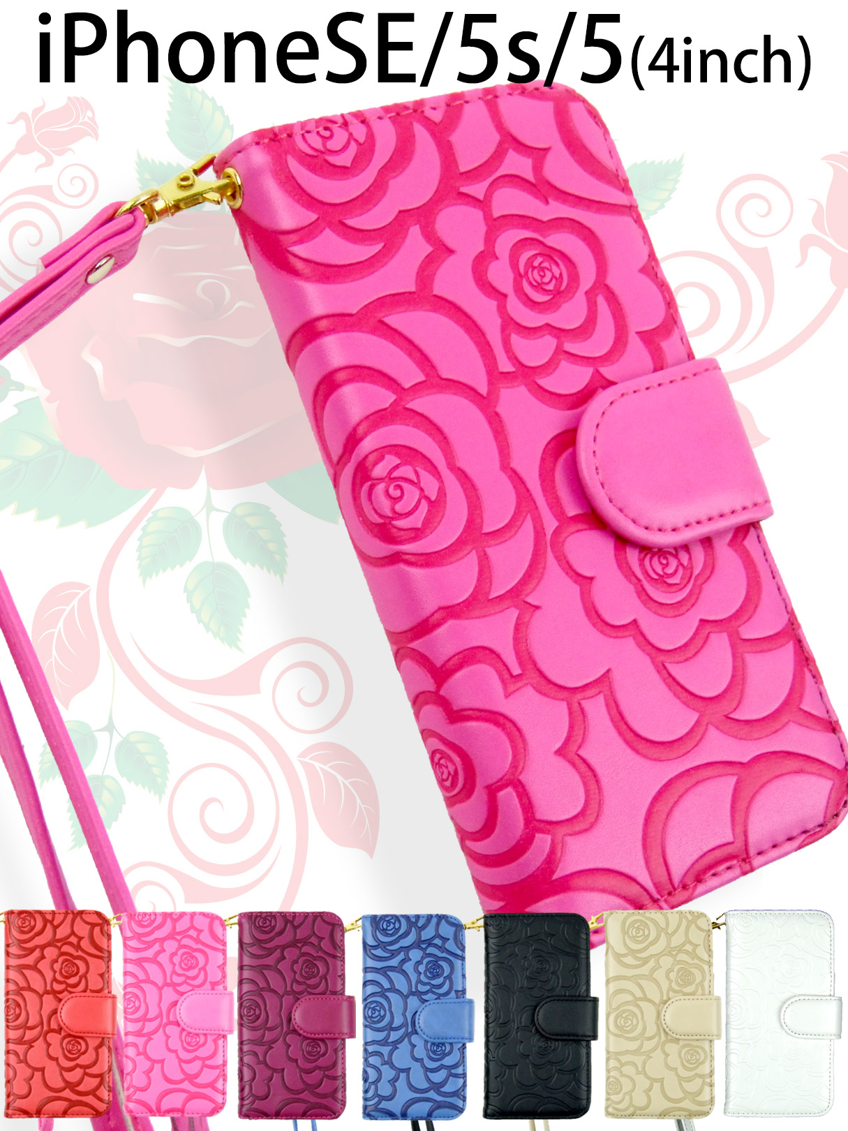 ◆手帳型iPhoneケース◆マットな質感のPUレザー製の二つ折りiPhoneケースです。上品さとキュートさを兼ね備えた花柄型押し。素材の発色も綺麗で高級感があります。シンプルでスマートなシルエットですが、内側にはカードケースやフリーポケットが付けられており、収納性も高く便利な仕様となってます。ストッパーはマグネットで固定できるので誤って開閉してしまうこともありません。 全7色※ご利用のモニター、ディスプレイにより若干色味に差がある場合がございます。ご了承ください。※商品の生産時における装飾等は海外にて手作業で行っており、多少の差異がある場合がございます。ご了承ください。