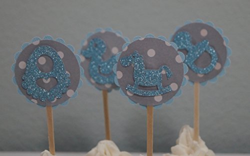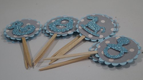Each pack has 12 cupcake toppers designed with (4) rocking horse, (4) bib, (4) pacifier (4) rubber ducky. These baby shower elements are set in double adhesive tape. This setting gives a floating illusion to the decor.