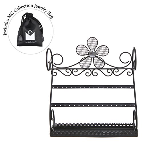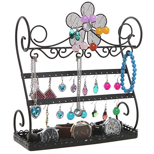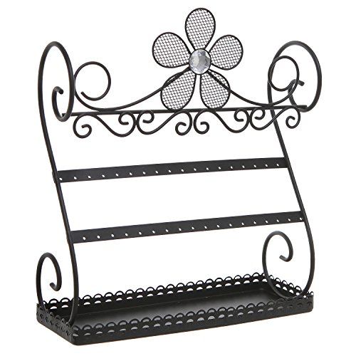 A dresser-top jewelry organizer made of metal and featuring a black finish, an elegant scrollwork design, and a flower-shaped earring holder with a rhinestone center.