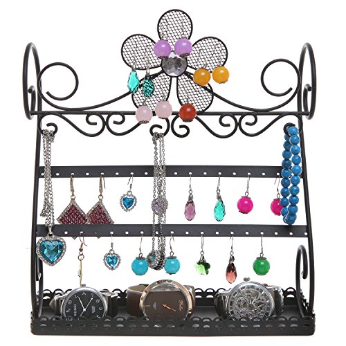 Boasts 2 horizontal earring bars (capacity: up to 18 pairs of earrings), 1 flower-shaped earring organizer with 5 petals made of metal mesh (capacity depends on size and shape of earrings), and 4 hanging hooks for necklaces and bracelets.