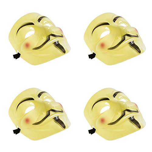 -. Brand : We pay your sales tax -. Color : Yellow -. EAN : 4861653176452 -. Feature : Set of 4 maks: Perfect for a costume, Halloween, Cosplay, or political events / Material: Plastic / Color: Yellow / Measurements approximately: 20cm x 16cm or 7.8" x 6.3" / The mask has an elastic strap on the back so it can be worn securely. -. PackageQuantity : 4 -. ProductGroup : Apparel -. ProductTypeName : CHILDRENS_COSTUME -. Size : 7.8" -. Title : Set of 4 Yellow V for Vendetta Guy Fawkes Anonymous Costume Cosplay Masks