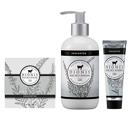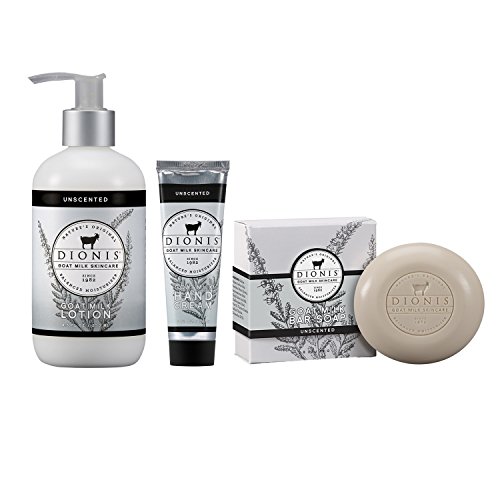 Dionis Goat Milk Skincare three item set that includes one 2.8-oz milled Bar Soap, one 8.5-oz Body Lotion and one 1-oz tube of Hand Cream in "Unscented" formula.
