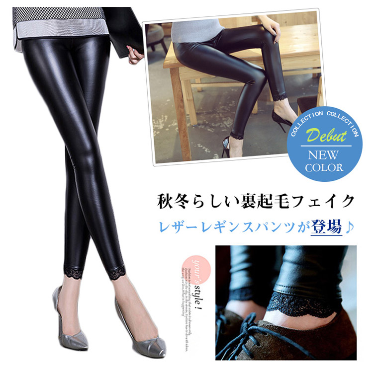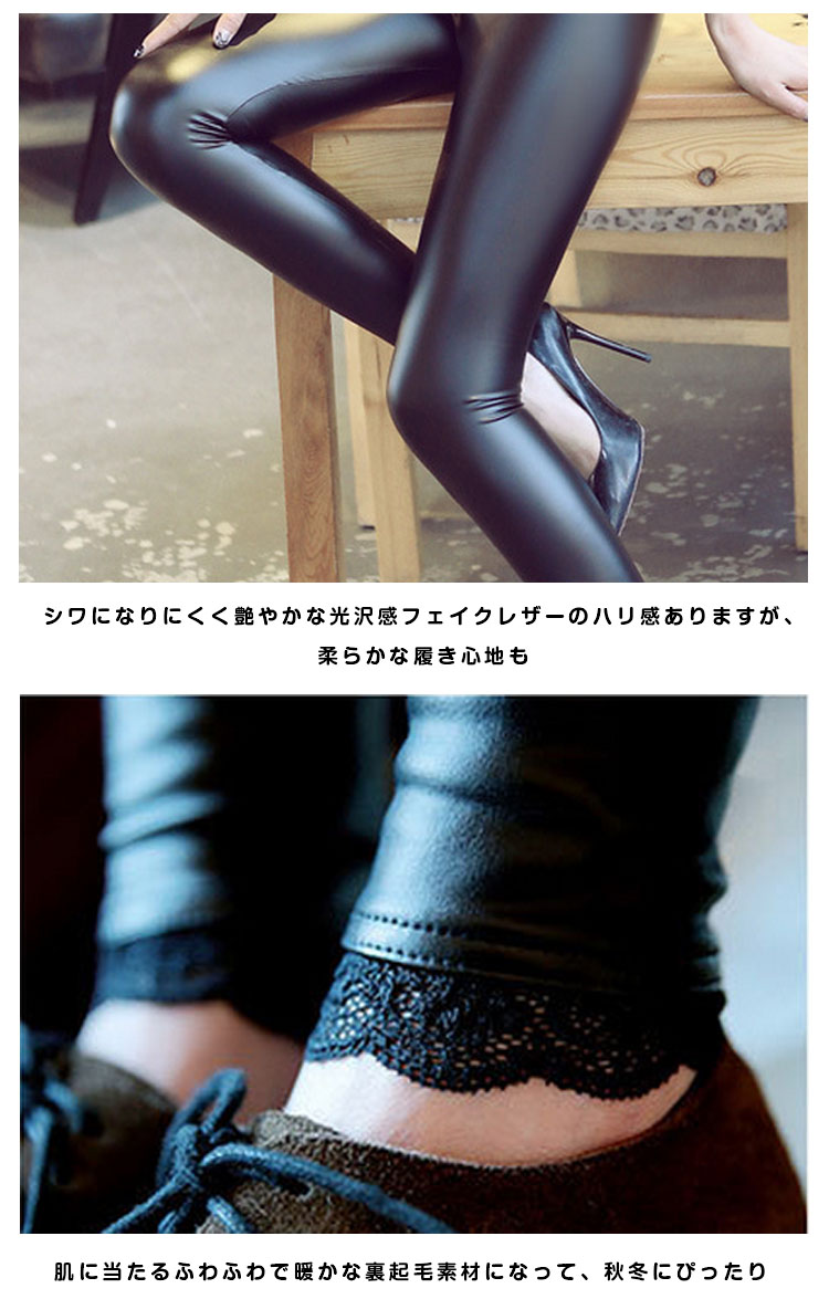 | 秋冬らしい裏起毛フェイクレザーレギンスパンツが登場♪伸縮性のある裏起毛素材のフェイクレザーが着痩せ効果抜群!!ウエスト部分はさらに平ゴム入りのしっかり設計だから、いろんなコーデと相性がいい★オシャレなセレブ風コーデに大変おすすめな一枚です。脚に女らしいレース切り替えでしっかりボトムスですので、ブーツインもしやすくなにかと便利◎ | |