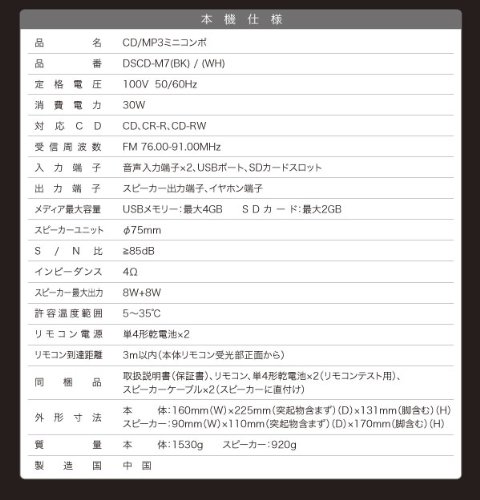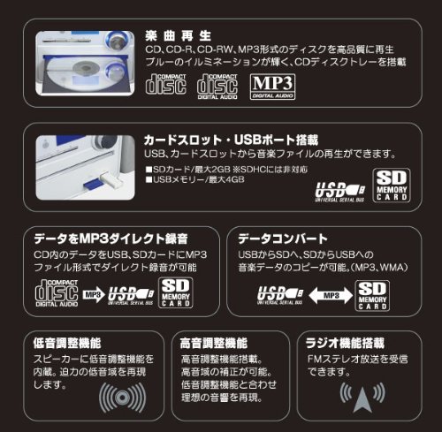 ●USBポートとSDカードスロットを搭載したマルチに使えるCDコンポ。■仕様定格電圧:100V 50/60Hz消費電力:30W入力端子:音声入力端子x2、USBポート、SDカードスロット出力端子:スピーカー出力端子、イヤホン端子メディア最大容量:USBメモリー:最大4GB SDカード:最大2GB