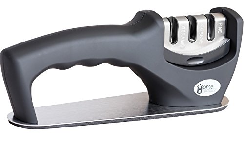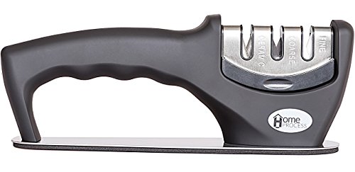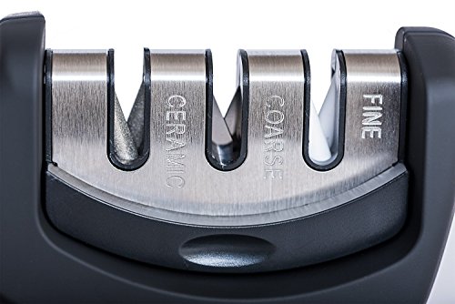 - STABLE: Rubber, full non-slip wide base, comfortable grip handle easy for even low-strength users, automatic blade angle control, 3 separate sharpening slots for sharpening ceramic, very dull, or slightly dull knives.