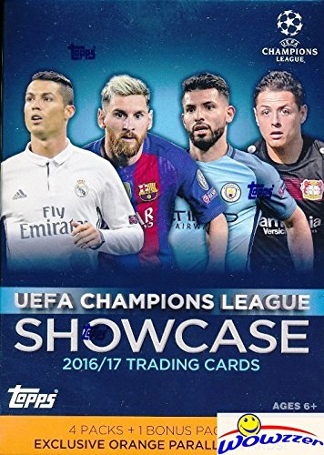 2017 Topps UEFA Champions League Showcase Soccer EXCLUSIVE Factory Sealed Retail Box with BONUS 5 5 ORANGE PARALLEL Cards! Look for Cards & Autographs of Ronaldo, Messi, Neymar & Many More! WOWZZER!