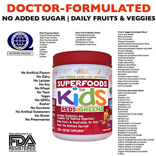 BOOST YOUR KIDS: If you're like most parents, you simply cannot get your kids to eat enough fruits and vegetables. Now you can take one serving of Superfood for KIDS, and get them the nutrition they need to be in order to stay healthy. With tons of berries, broccoli, spinach, kale, spirulina and dozens of other ingredients including probiotics, digestive enzymes, antioxidants, vitamins and minerals, this one green Superfood covers all the bases for a growing child.