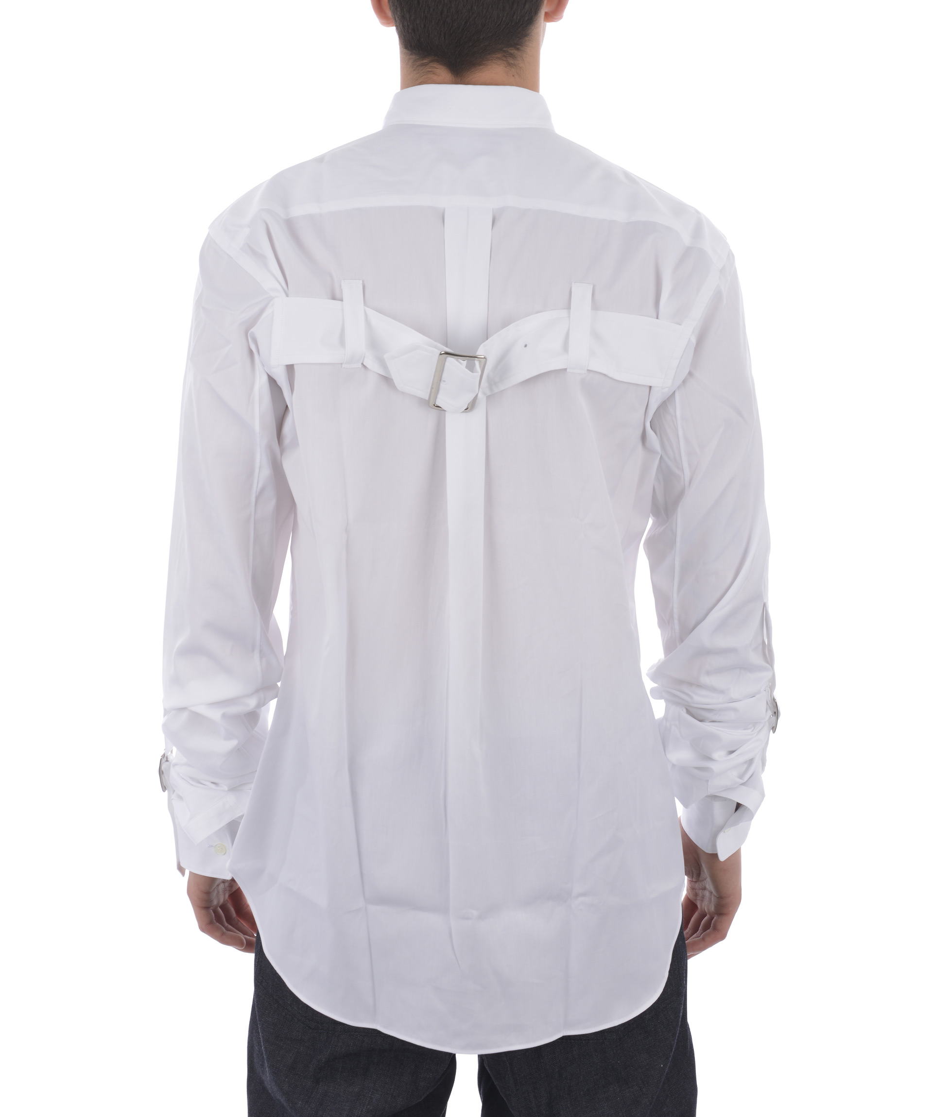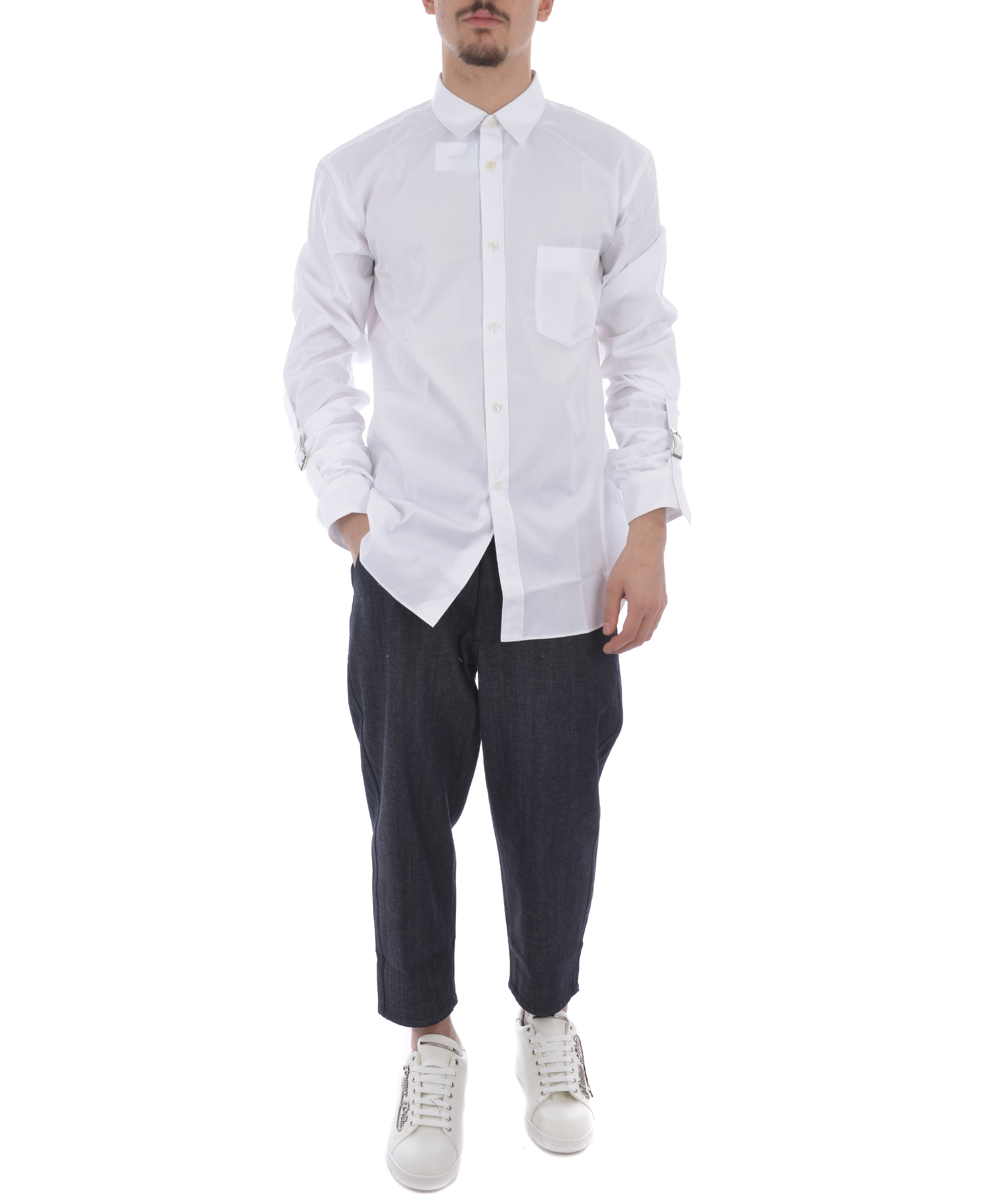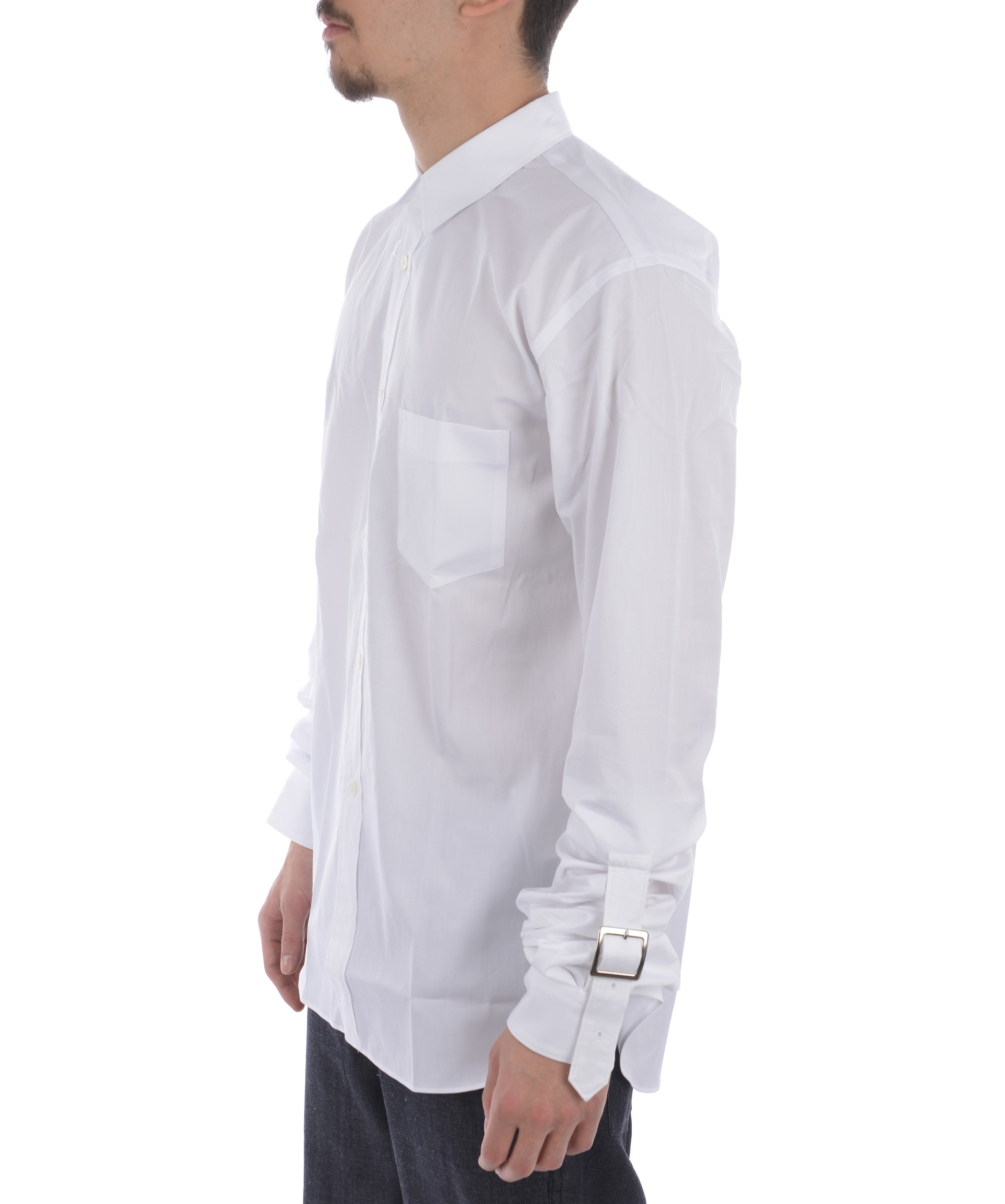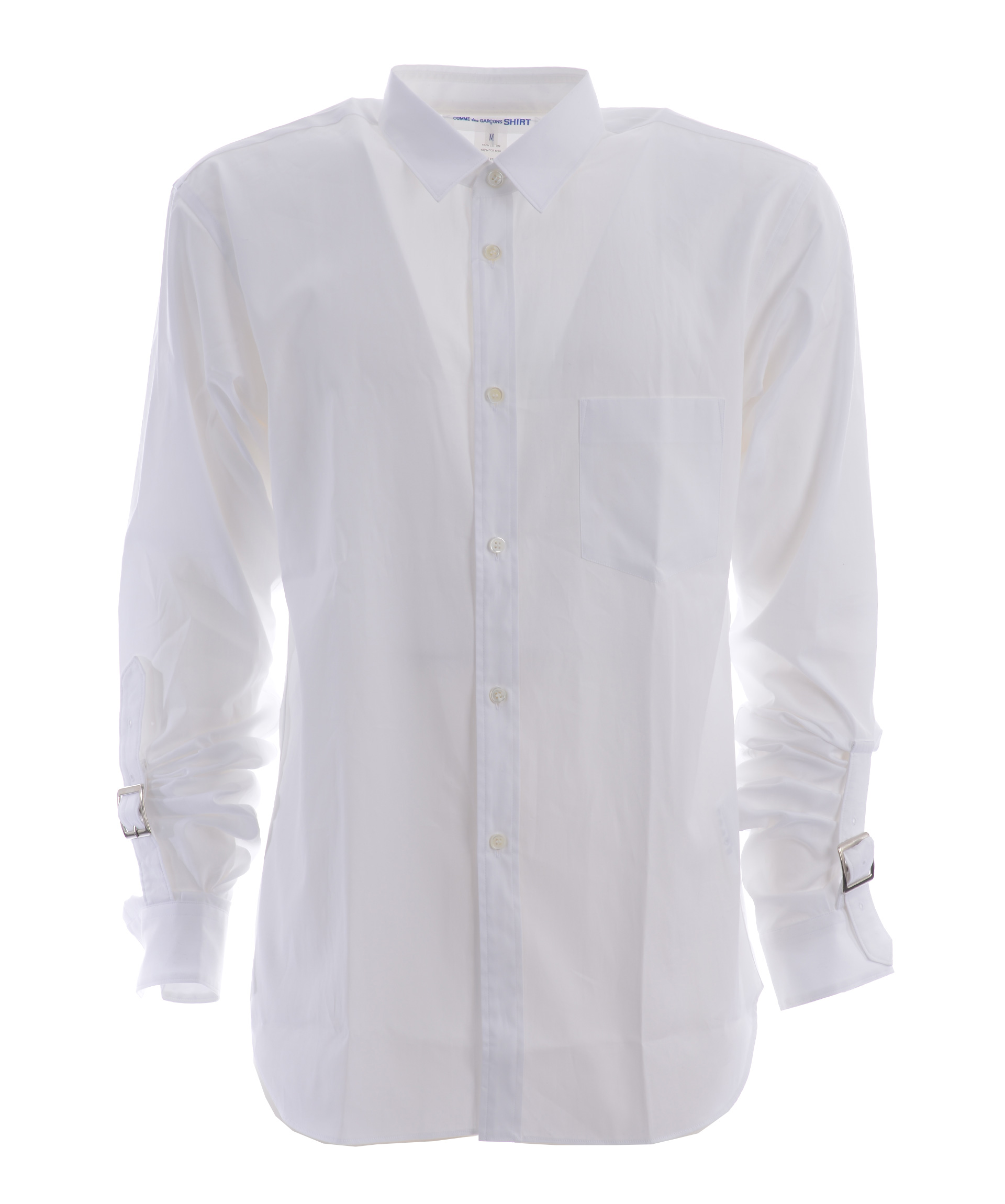 Strapped Cuffs Shirt from Comme Des Garçons Shirt: White Strapped Cuffs Shirt with classic collar, long sleeves, front button closure, button cuffs and curved hem.