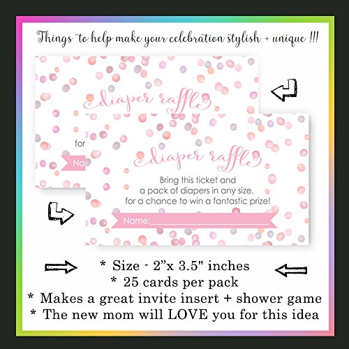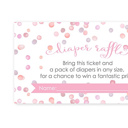 Studio : Paper Clever Party Publisher : Paper Clever Party Product Description Coral pink confetti dot baby shower diaper raffle insert cards are a great way to announce the upcoming diaper raffle. Abstract watercolor dot diaper raffle cards feature a fun design. The mixture of pink hues is sure to work with a variety of baby shower party themes. Girls baby shower diaper raffle cards are perfectly sized to pop in with your baby shower invitations. Raffle insert cards double as a baby shower activity that is easy and great for all ages. You can choose to purchase a few extras to hand out at the baby shower for guests who brought multiple diaper packs. Diaper cards are business card sized, set of 25 per package. Ready to use. 0