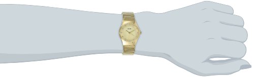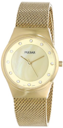 Round watch in stainless steel with mother-of-pearl inner dial and gold-tone outer dial with round crystal hour markers