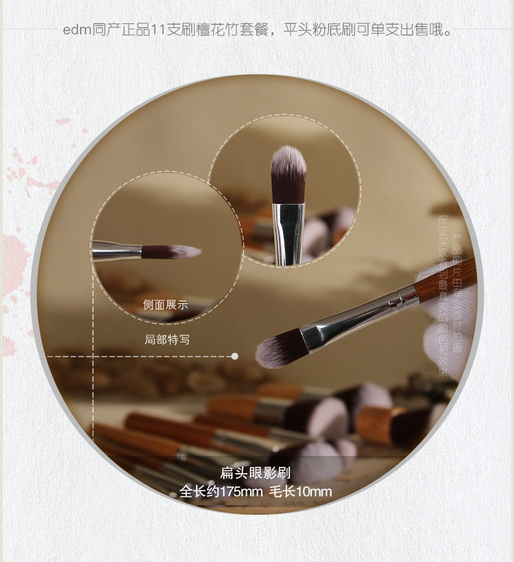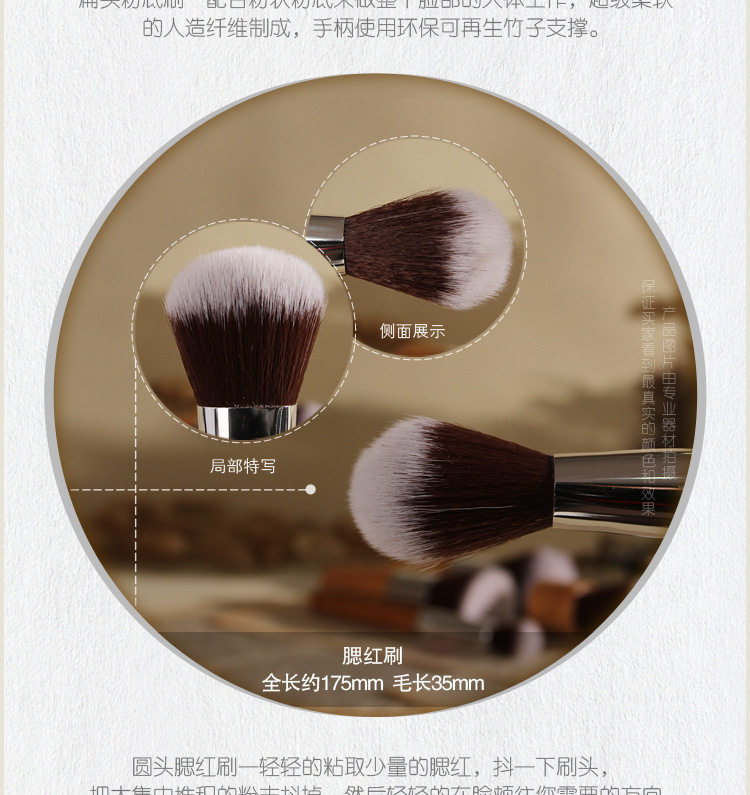 描述:11种不同形状刷头,包含腮红,粉底,散粉,遮瑕,眼影,鼻影,唇刷等,精细环保的竹杆不易滋生细菌,含1个布袋。超细人造纤维毛!轻巧,舒适,专业!