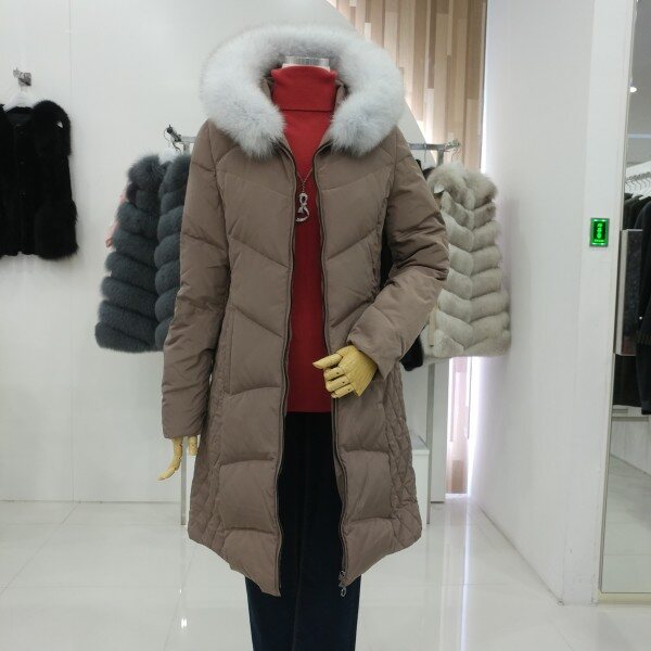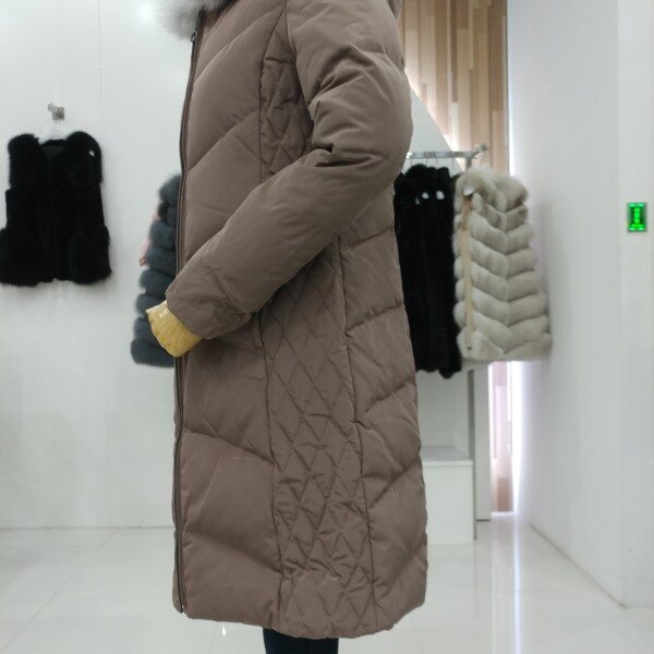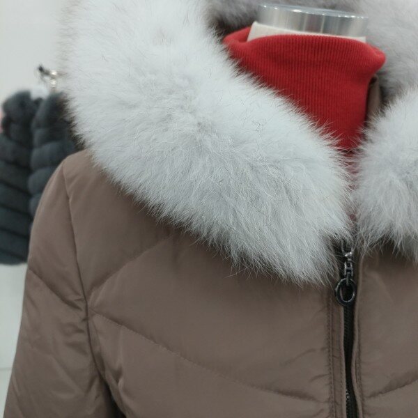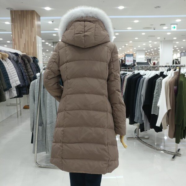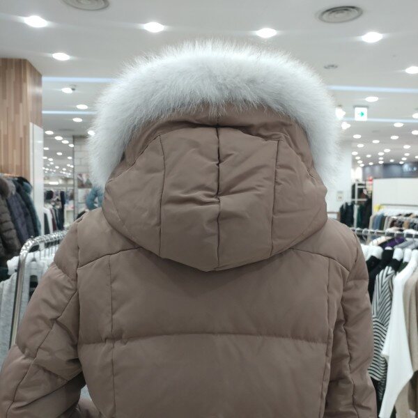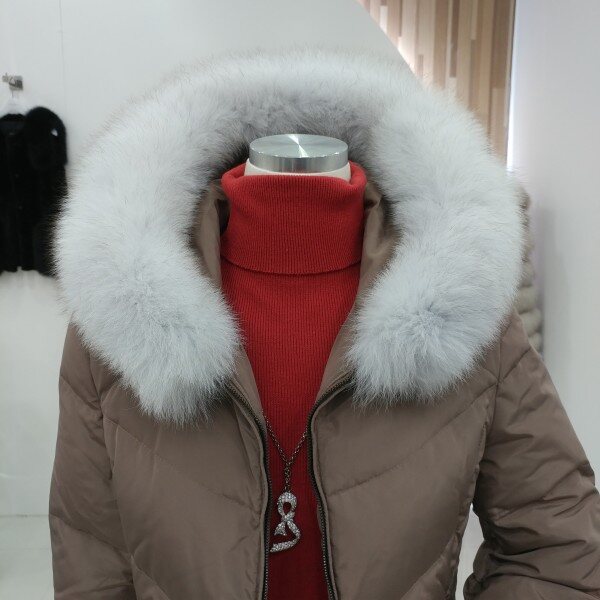 후드와 일체형이면서 고급스러운 화이트 리얼폭스퍼가 트리밍되고 사이드의 다이아몬드봉제로 전체라인을 늘씬하게 보여드리며