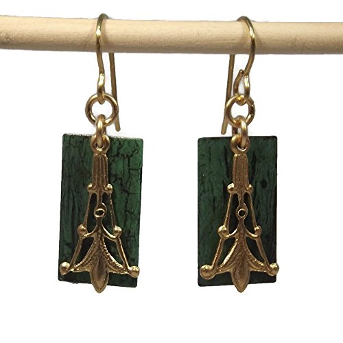 -. Title : 1-1/2" Hand Crackle Painted Fleur Filigree Dangle Drop Earrings, OOAK, One of a Kind, Green & Gold Colored